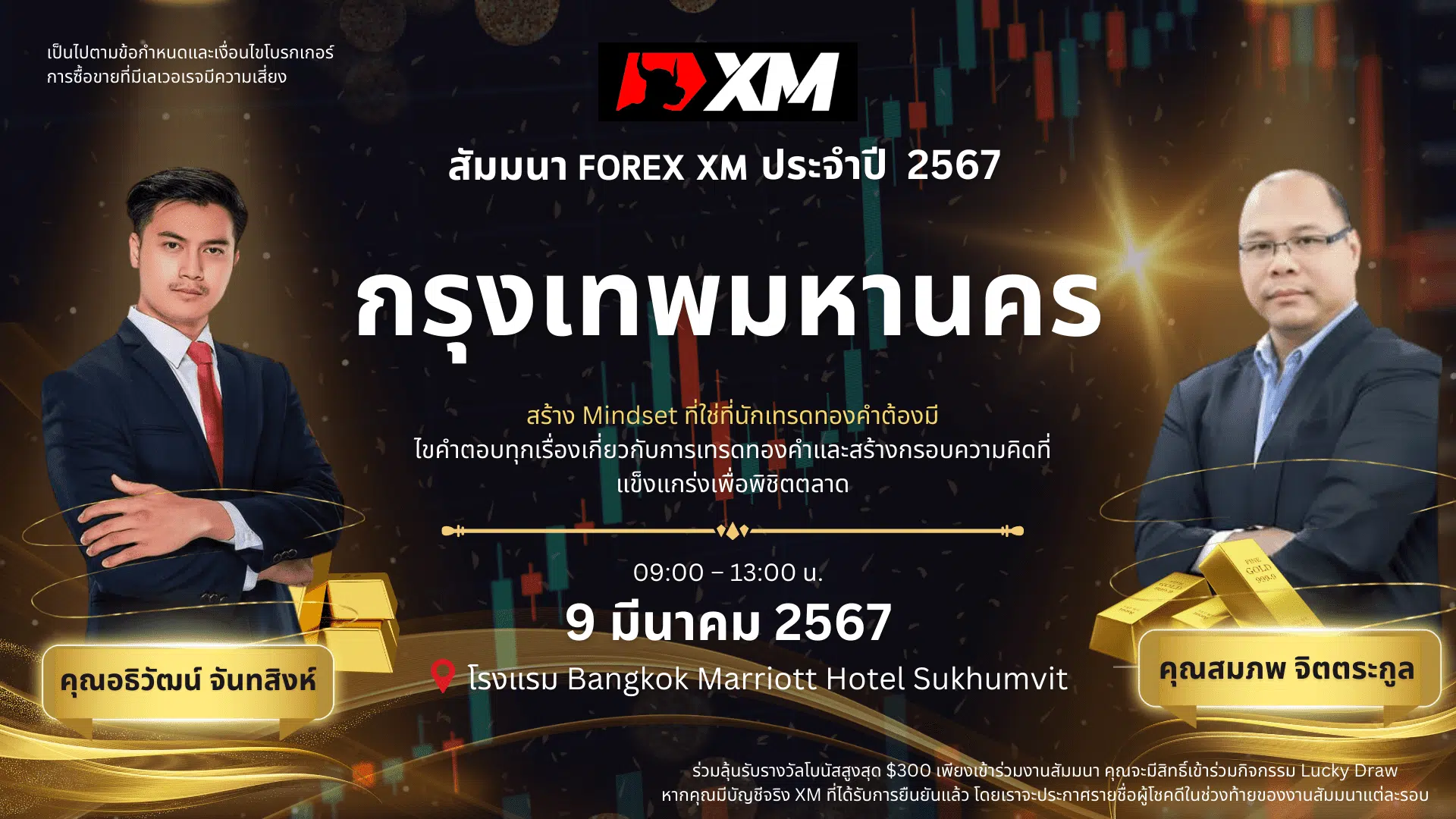 สัมมนา XM กรุงเทพ วันที่ 9 มีนาคม 2567 สร้าง Mindset ที่ใช่ที่นักเทรดทองคำต้องมี ประจำปี 2567 ไขคำตอบทุกเรื่องเกี่ยวกับการเทรดทองคำและสร้างกรอบความคิดที่แข็งแกร่งเพื่อพิชิตตลาด