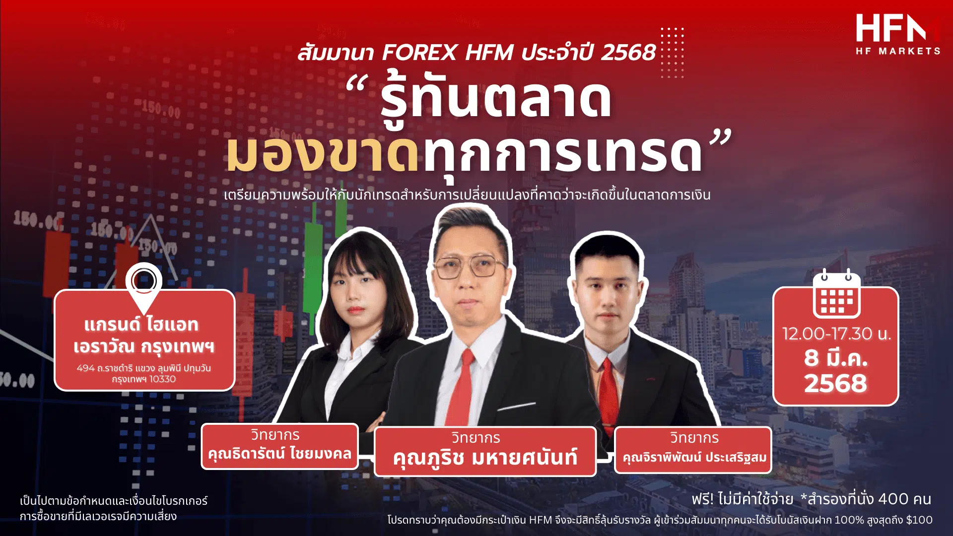 งานสัมมนา Forex สัมมนา HFM ในหัวข้อเรื่อง ‘รู้ทันตลาด มองขาดทุกการเทรด’ ได้รับการออกแบบมาเพื่อเตรียมความพร้อมให้กับนักเทรดสำหรับการเปลี่ยนแปลงที่คาดว่าจะเกิดขึ้นในตลาดการเงิน โปรแกรมที่ครอบคลุมนี้จะมอบเครื่องมือและข้อมูลเชิงลึกที่จำเป็นให้กับผู้เข้าร่วมเพื่อช่วยในการปรับตัว และรับมือกับการเปลี่ยนแปลงในเศรษฐกิจโลก ปัจจัยพื้นฐาน และแนวโน้มการวิเคราะห์ทางเทคนิค โดยการกล่าวถึงภูมิทัศน์ที่เปลี่ยนแปลงของแนวโน้มตลาดในปี 2025 งานสัมมนานี้จะช่วยให้เทรดเดอร์มีความพร้อมในการดำเนินการเชิงรุก ปรับปรุงกลยุทธ์ และวางตำแหน่งตัวเองเพื่อผลลัพธ์ที่ดีที่สุดในสภาพแวดล้อมการซื้อขายที่เปลี่ยนแปลงตลอดเวลา